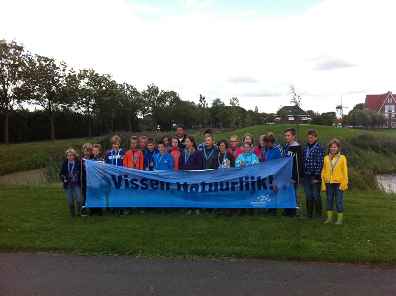 De leerlingen krijgen eerst les van een heuse vismeester van Sportvisserij Nederland, waarna er 's middags gevist werd!