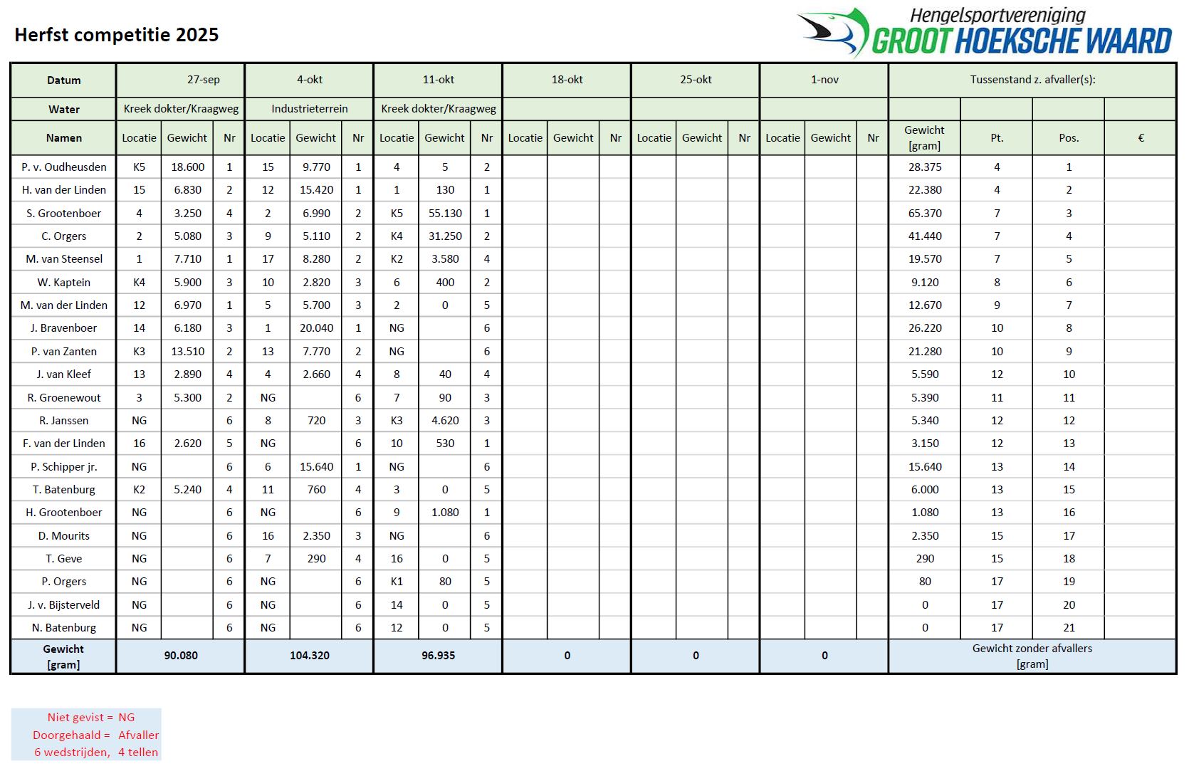 Tijd eerste drie : 08.00 - 12.00 uur Loten eerste drie : 06.45 uur* Tijd laatste drie : 08.30 – 12.30 uur Loten laatste drie : 07.15 uur* Inleg serie : € 21,00 per serie, € 18,00 voor AOW-ers Inleg los : € 3,50 per wedstrijd, € 3,00 voor AOW-ers Soort serie : individueel Hengeltype : zie wedstrijd (vast = max. 11,5 mtr.) Prijsberekening : in vakken op punten, 4 wedstrijden tellen Prijsuitreiking : 08-11-2025 in Boezem en Co. * Locaties loten: Kraagweg: Kraagweg 7, Zuid-Beijerland Industrieterrein: parkeerplaats Gamma Oud-Beijerland Kreek dokters: parkeerplaats Boezem en Co. Vooraf opgeven bij Dieter Mourits (06-36595795)