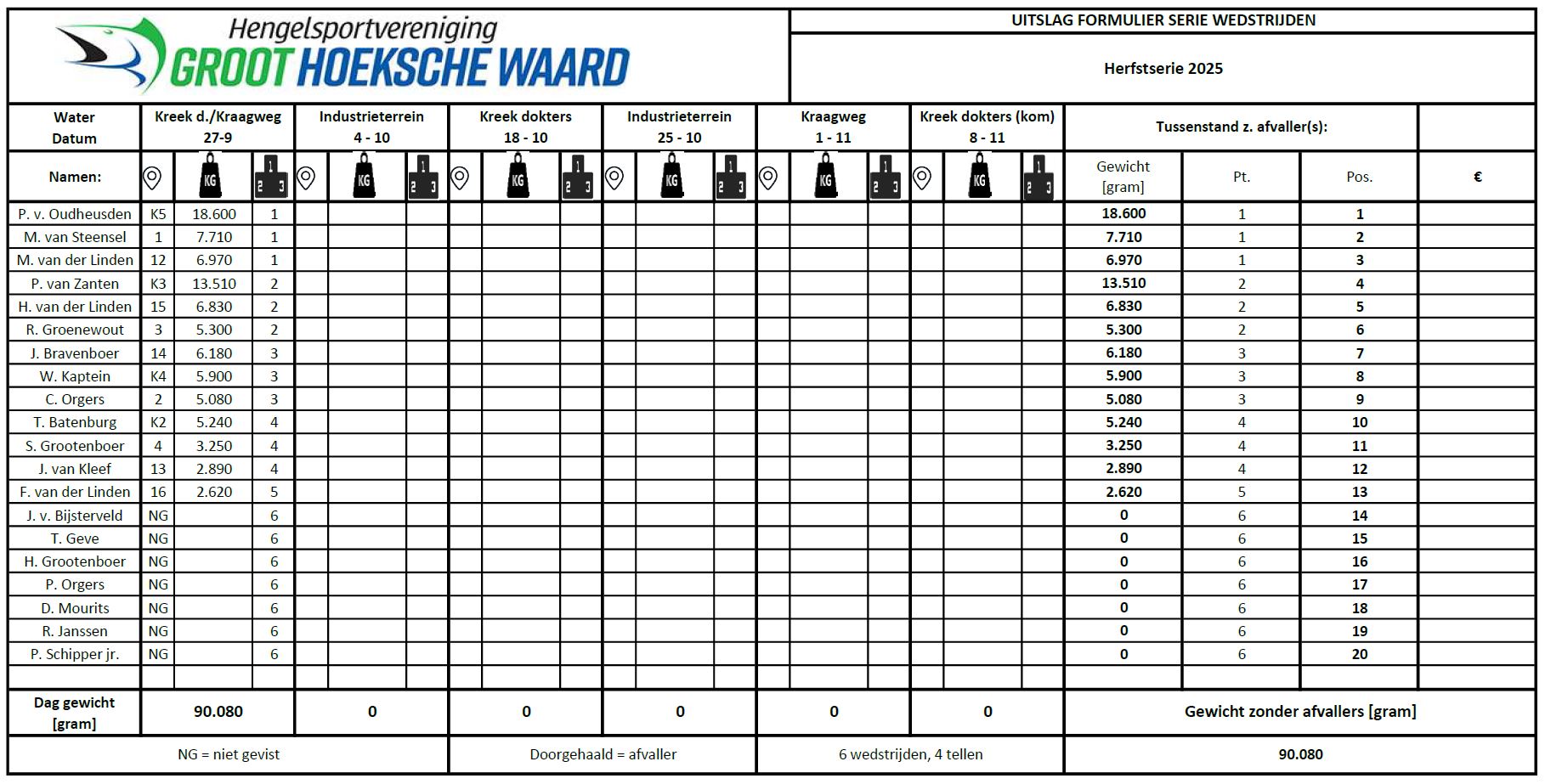 Tijd eerste drie : 08.00 - 12.00 uur Loten eerste drie : 06.45 uur* Tijd laatste drie : 08.30 – 12.30 uur Loten laatste drie : 07.15 uur* Inleg serie : € 21,00 per serie, € 18,00 voor AOW-ers Inleg los : € 3,50 per wedstrijd, € 3,00 voor AOW-ers Soort serie : individueel Hengeltype : zie wedstrijd (vast = max. 11,5 mtr.) Prijsberekening : in vakken op punten, 4 wedstrijden tellen Prijsuitreiking : 08-11-2025 in Boezem en Co. * Locaties loten: Kraagweg: Kraagweg 7, Zuid-Beijerland Industrieterrein: parkeerplaats Gamma Oud-Beijerland Kreek dokters: parkeerplaats Boezem en Co. Vooraf opgeven bij Dieter Mourits (06-36595795)